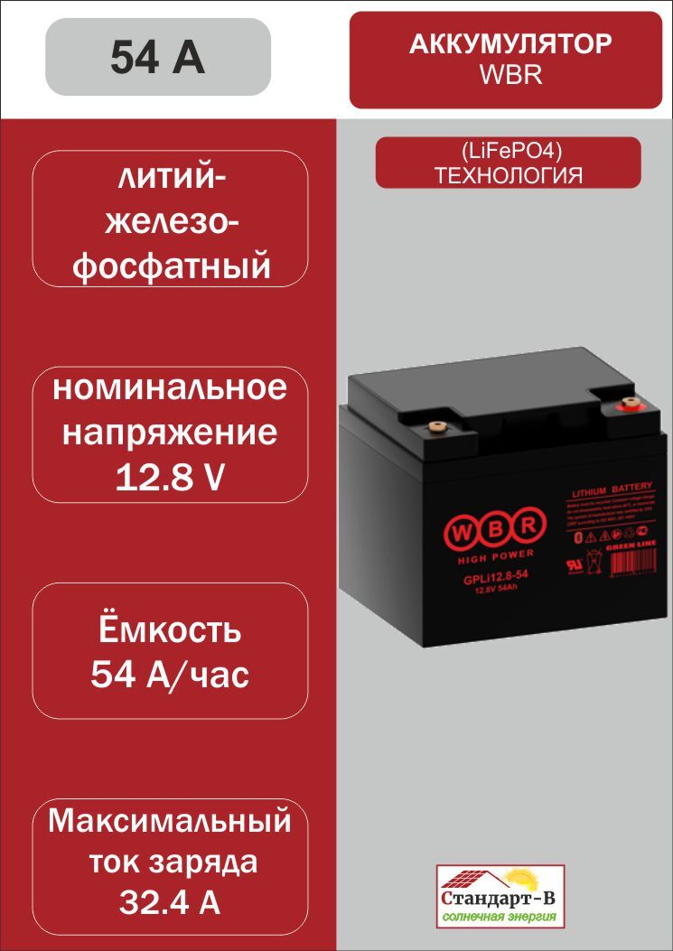 Аккумулятор WBR литий-железо-фосфатные (LiFePO4), обладающие высоким качеством и надежностью, увеличенной в 10 раз цикличностью использования и уменьшенным на 60% весом по сравнению со свинцово-кислотными аккумуляторными батареями. Современная технология производства аккумуляторов с использованием химического взаимодействия углерода и феррофосфата на основе литий-ионных аккумуляторов исключает риск воспламенения или взрыва при сильном ударе, перезаряде или коротком замыкании.